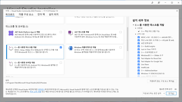 Windows용 Flutter 엔진을 빌드하기 위해서는 꼭 C++ 컴파일러가 필요하고, 플러그인 개발 시 C++ 코드를 처리해야 하는 경우도 존재하기 때문에 Windows에서 C++ 컴파일러를 사용할 수 있는 도구인 Visual Studio with C++가 필요합니다.