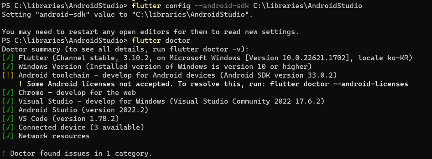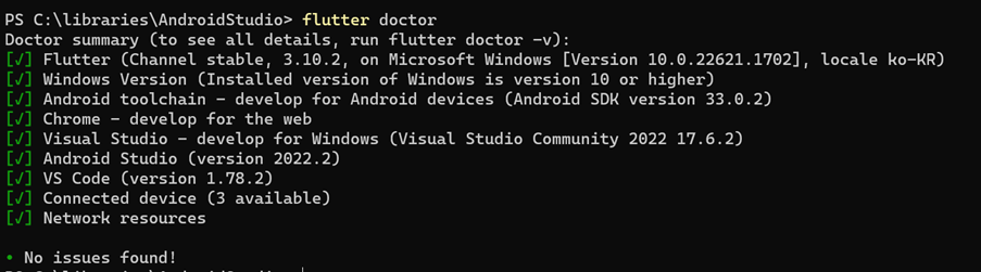 이제 다시 한 번 flutter doctor로 검사를 진행해봅니다.