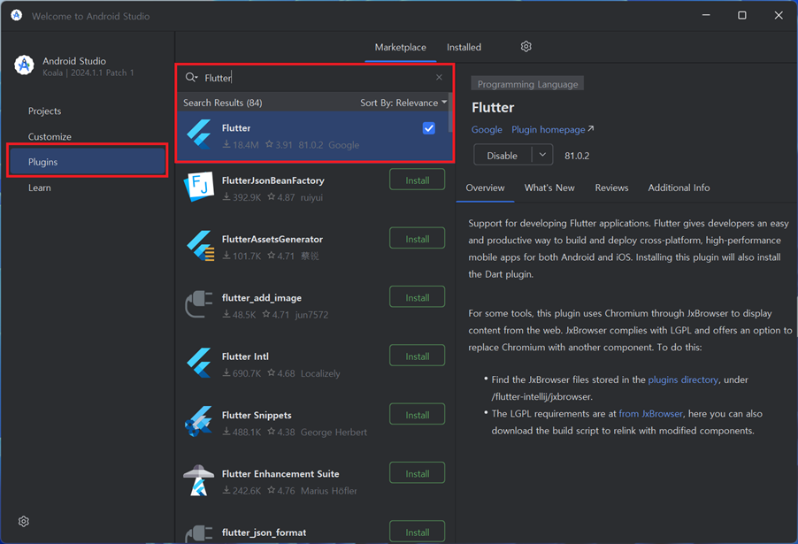 Flutter프로젝트를 생성하기 위해 Flutter와 Dart 플러그인을 설치해야 합니다. (Flutter를 설치하면 자동으로 Dart를 설치하는 팝업창도 생성됩니다.)