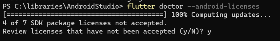flutter doctor --android-licenses 명령어를 이용해 라이선스를 승인합니다.